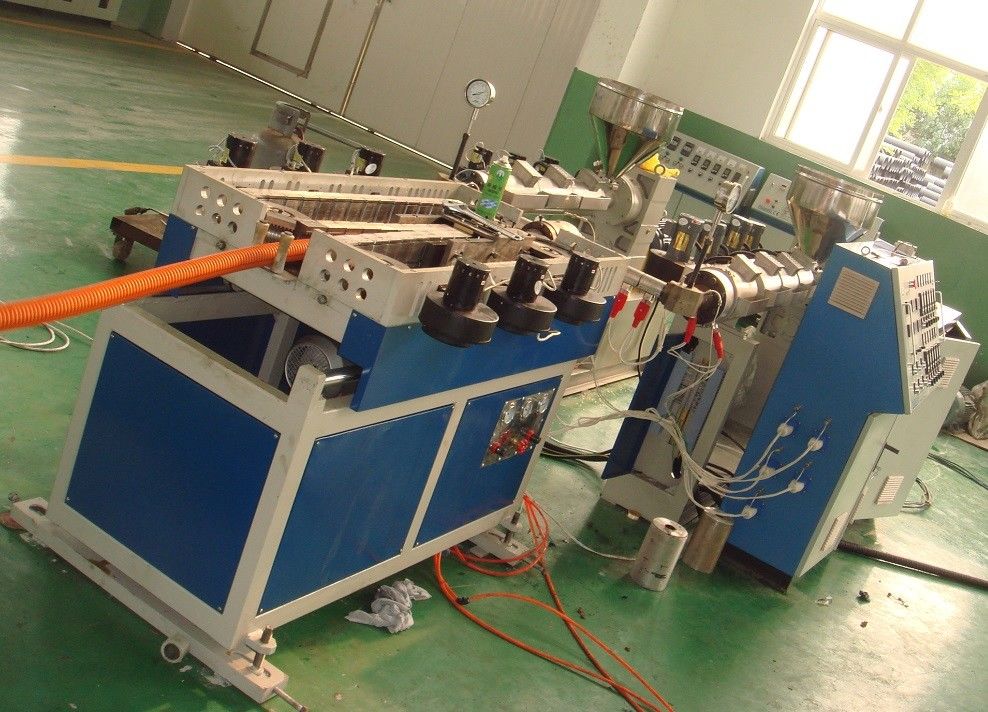 押出機:高速および効率の単一ねじ押出機、低雑音ファンの、高速および堅いギヤ減力剤が装備されている溝があるバレル。それは内部を作ることができ、外の層は別の材料を作り出し、高性能の放出を保証します。